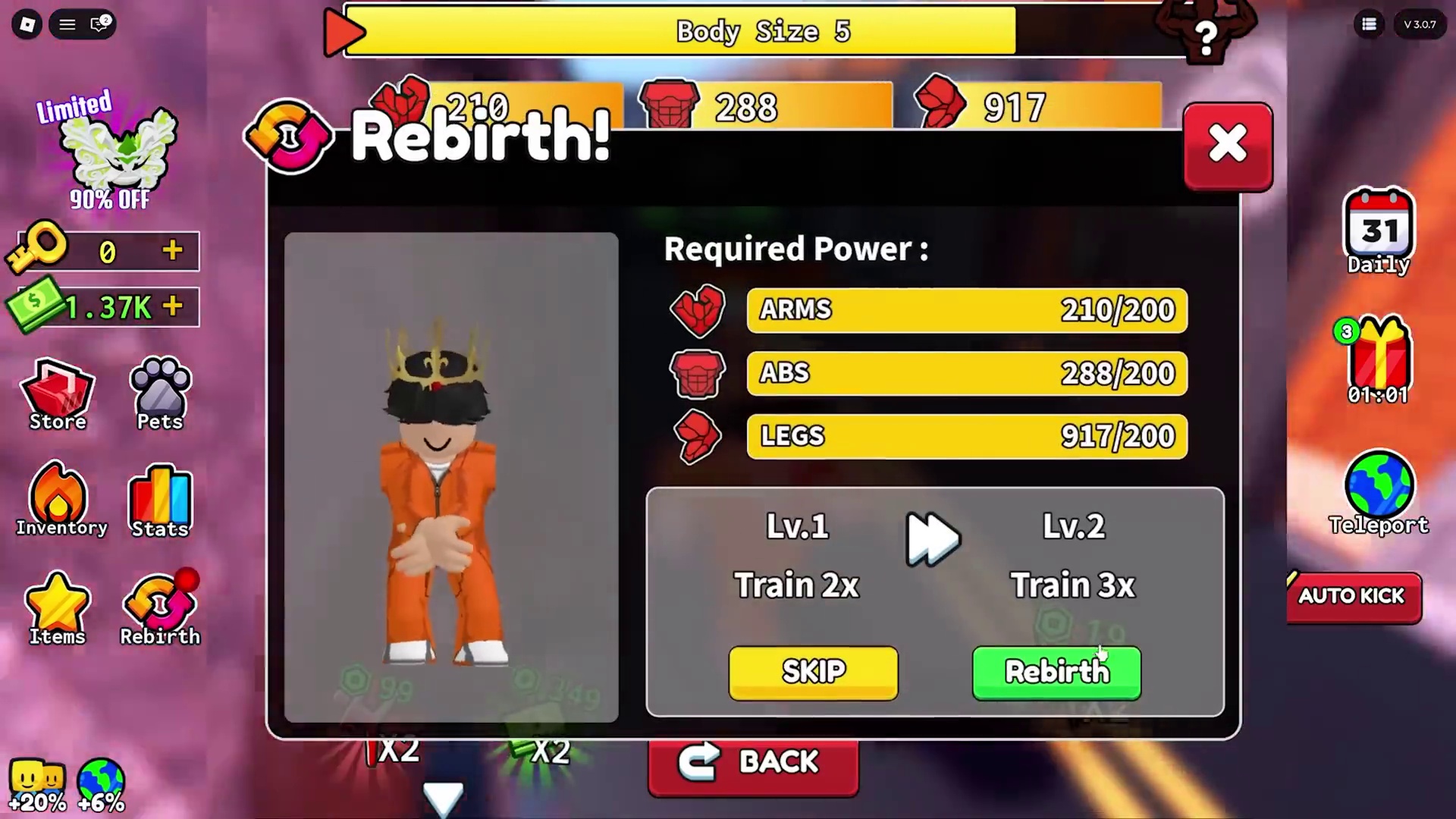 After some significant training, MongoBlox reaches a point where he can 'Rebirth.' This crucial game mechanic resets his body size and basic power back to level 1, but provides a multiplier for future training and power gains. He makes the decision to rebirth, understanding that this temporary setback will lead to greater long-term power.