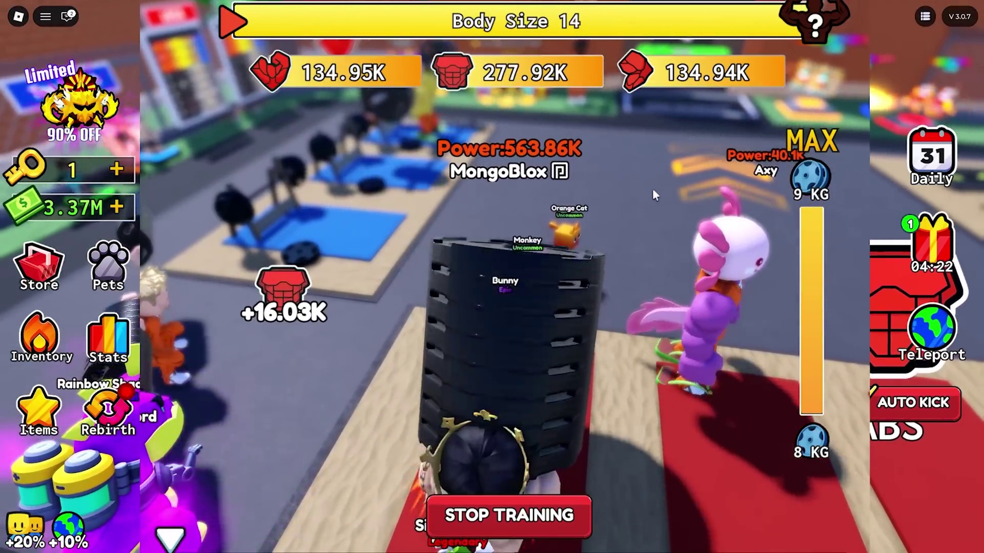 With the rebirth multiplier in effect, training becomes much faster. MongoBlox strategically purchases boosts like 'Double Legs!' and 'Double Abs!' to further accelerate his power gain. He rapidly grows in size and strength, showcasing the compounding benefits of rebirth and purchasing essential boosts. His loyal pet, Dog, accompanies him throughout the training, contributing to his progress.